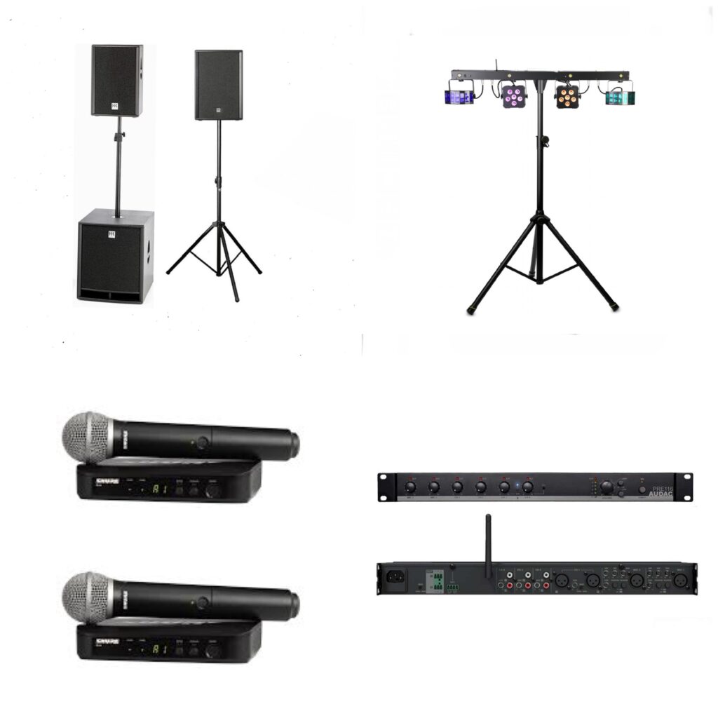 En komplet pakke, som er nem at tilslutte og en perfekt løsning for op til 150 personer. Med vores lyd-, lys- og trådløse mikrofonpakke får I en mindeværdig oplevelse af musik, tale og dans. Trådløse mikrofoner gør det muligt for talere at bevæge sig frit rundt i rummet uden at miste kontakten med gæsterne.